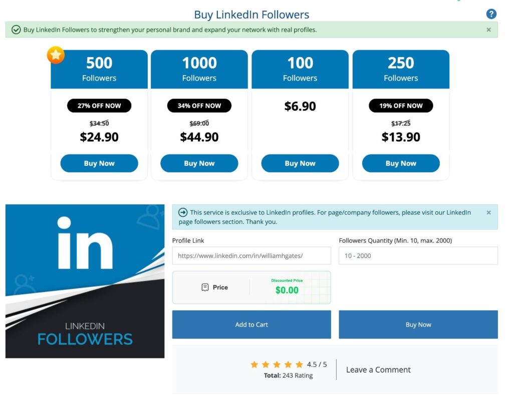 LinkedIn follower plans start at $39.99 for 100 followers and reach $1,099.99 for 10,000 followers, making it one of the most expensive yet scalable options.